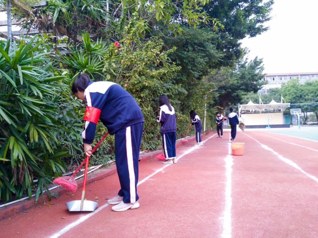 提前到達(dá)操場(chǎng)的是王廷榮、黃詩(shī)文、李仁懷、李燦彬、溫善媛等同學(xué)。他們揮動(dòng)著掃把便開始“沙沙”地清掃落葉,掃地的聲音好像鳥兒在對(duì)他們唱歌,又像是在鼓勵(lì)他們:“勞動(dòng)的孩子最美麗”。