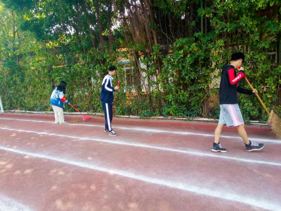 清晨,志愿者在陽光下打掃校園