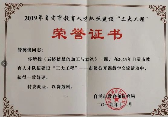 管英?。褐袑W(xué)一級(jí)教師,市骨干教師、市優(yōu)秀教育工作者,長期擔(dān)任市縣信息技術(shù)學(xué)科教學(xué)比賽評(píng)委。